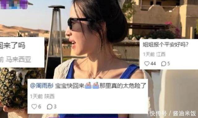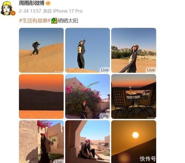 第二件事情就是近期中东局势突变,有不少明星被滞留在了中东,就比如女演员周雨彤2月下旬前往中东度假,24日还晒出沙漠惬意日常,26日又分享阿布扎比泳池身影,眉眼间满是松弛,谁曾想,一场危机正悄然笼罩。